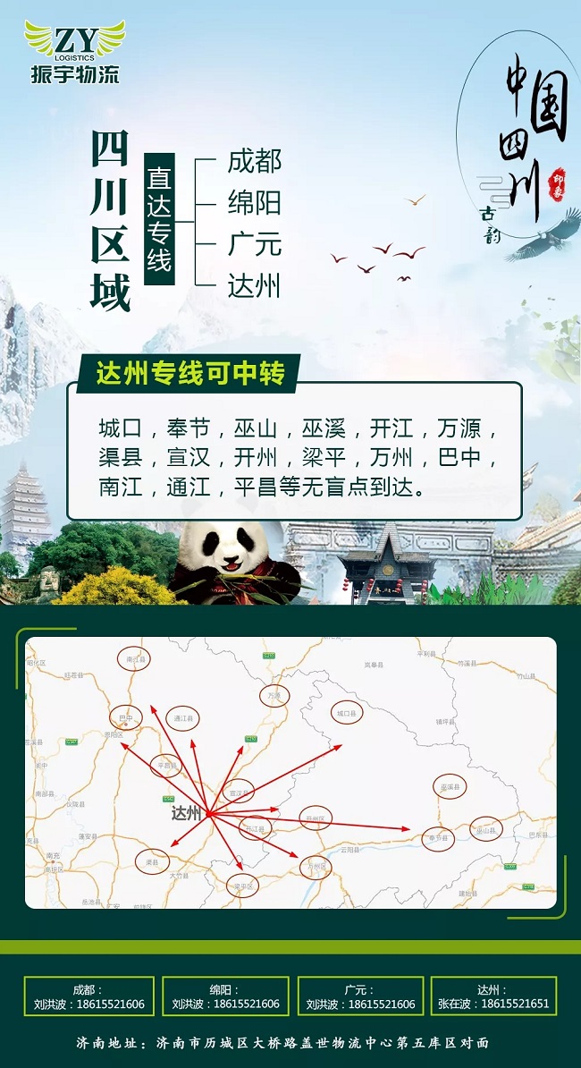 達州專線可中轉城口,奉節,巫山,巫溪,開江,萬源,渠縣,宣漢,開州,梁平,萬州,巴中,南江,通江,平昌等無盲點到達,解決大件異行設備的中轉困難!