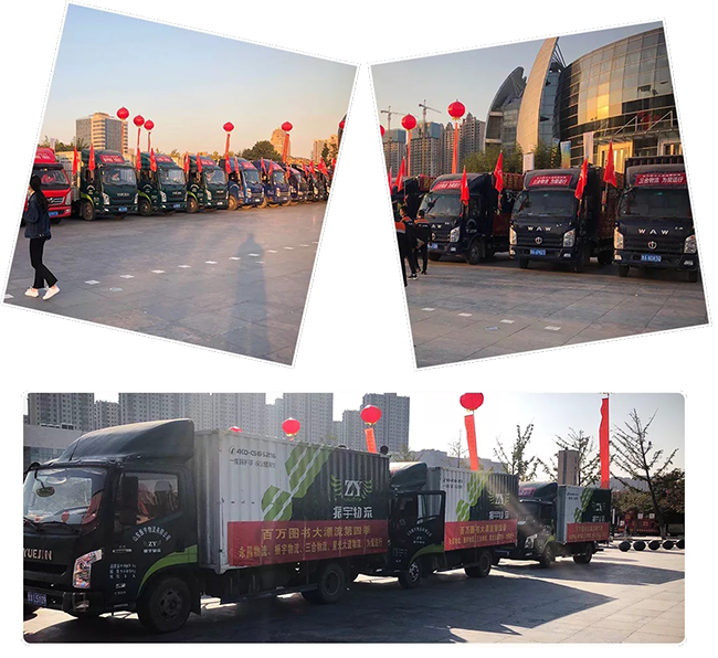 振宇物流積極捐贈圖書,為愛護航 ,通過自己的方式和力量,助力百萬圖書大漂流!現場物流車輛整齊排開,氣勢如虹……