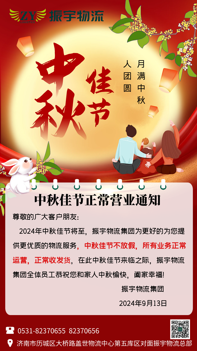 2024年中秋佳節將至,振宇物流集團為更好的為您提供更優質的物流服務,中秋佳節不放假,所有業務正常運營,正常收發貨,在此中秋佳節來臨之際,振宇物流集團全體員工恭祝您和家人中秋愉快,闔家幸福!