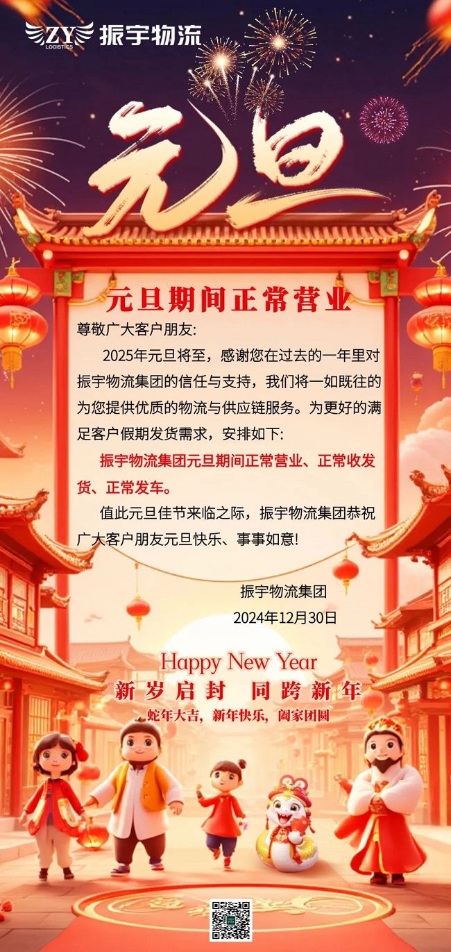 2025年元旦將至,感謝您在過去的一年里對振宇物流集團的信任與支持,我們將一如既往的為您提供優質的物流與供應鏈服務。為更好的滿足客戶假期發貨需求,安排如下: