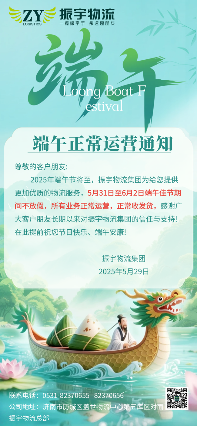 2025年端午節將至,振宇物流集團為給您提供更加優質的物流服務,5月31日至6月2日端午佳節期間不放假,所有業務正常運營,正常收發貨,感謝廣大客戶朋友長期以來對振宇物流集團的信任與支持!在此提前祝您節日快樂、端午安康!