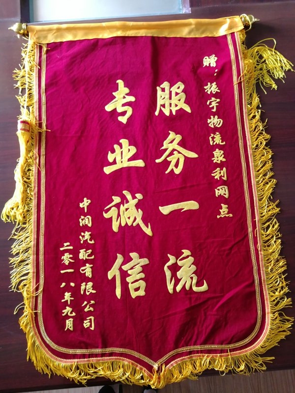 振宇物流泉利網點近日收到中潤汽配有限公司贈送的錦旗,內容為“專業誠信,服務一流”,感謝中潤汽配有限公司對振宇物流的信任和支持!