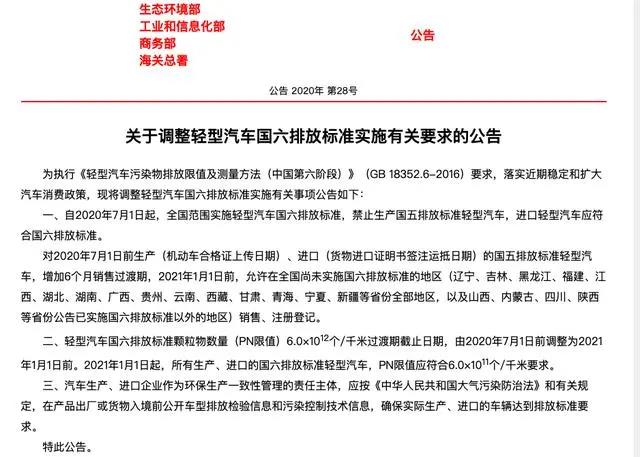 同時,公告表示,輕型汽車國六排放標準顆粒物數量(PN限值)6.0×1012個/千米過渡期截止日期由2020年7月1日前調整為2021年1月1日前。2021年1月1日起,所有生產、進口的國六排放標準輕型汽車,PN限值應符合6.0×1011個/千米要求。