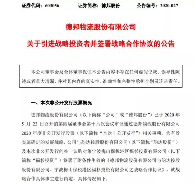5月24日晚間披露非公開發行預案,擬募集資金總額不超過6.14億元,用于轉運中心智能設備升級項目和IT信息化系統建設項目。本次非公開發行的發行價格為9.20元/股,發行對象為福杉投資。本次非公開發行完成后,福杉投資預計持有公司總股本比例約為6.5%,福杉投資依托于韻達股份的相關戰略資源,與德邦股份具體開展戰略合作。