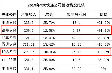 而根據德邦股份發布了2019年業績報告,2019年實現營業收入259.22億元,同比增長12.58%;實現歸屬上市公司股東凈利潤3.24億元,同比下滑53.82%。扣非凈利潤下降-91.94%。在虧損的邊緣徘徊。