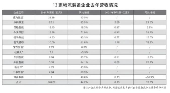 截至4月30日,A股主要上市企業均發布年報,其中包括以智能物流分揀系統為主要業務的11家企業,加之即將IPO的2家企業披露全年業績,13家企業2021年營收合計為148.1億元,2020年為102.8億元,增長44.2%(見圖表)。
