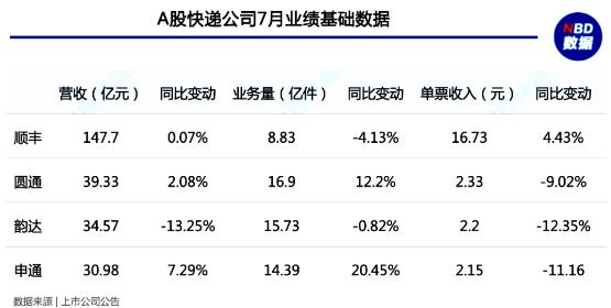 8月18日晚間,A股4家快遞公司發布7月業績,綜合各家披露的數據可以看到,快遞頭部企業的下半年業績競爭愈演愈烈,其中,申通快遞營收和業務量的增速繼續領先,圓通速遞穩坐加盟制老二的寶座,韻達股份雖然業績難止下滑,但是其與申通的業務量差距正在拉大,追趕動作明顯。