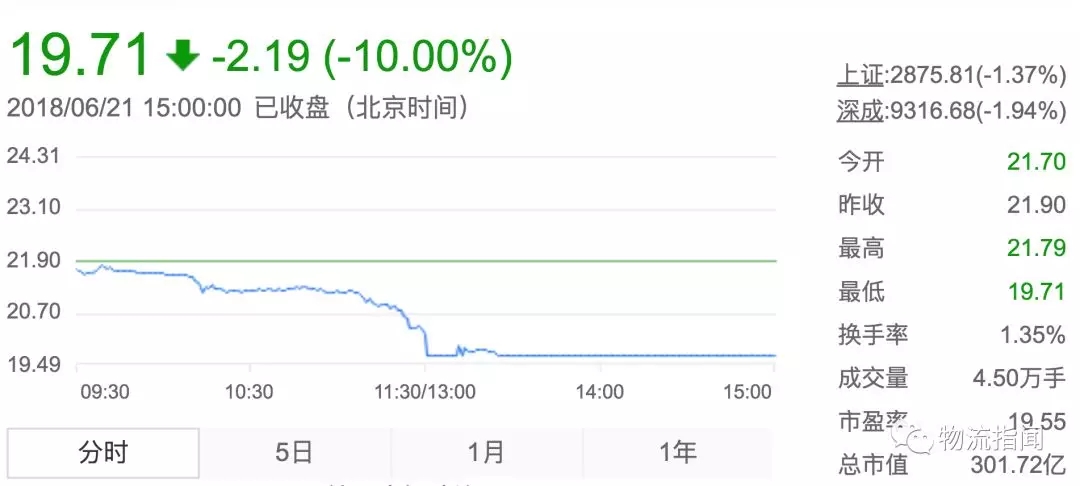 6月21日消息,申通快遞低開低走,午后股價閃崩跌停,截止發稿,申通快遞封死跌停板,報19.71元,創下上市以來股價新低,成交額為8712萬元。