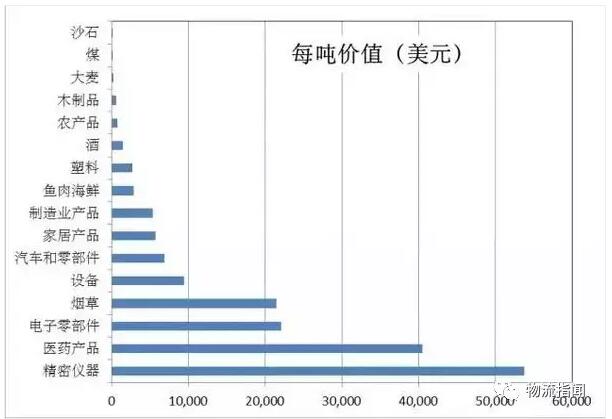 其次是經濟水平決定的貨物價值。同樣一公斤貨,因為單公斤貨物價值的不同會對GDP產生很大影響。例如下圖是美國不同類別的貨物平均每噸的價值,可以看到差別非常大,一噸煤和一噸煙草價值可以相差100倍。同樣一噸貨物,價值更高對應的GDP就更高。